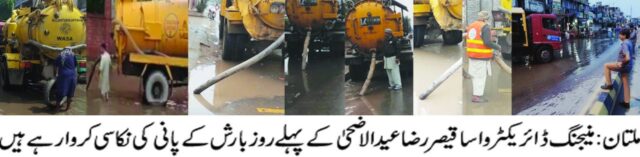 سہہ پہر کے اوقات شہر کے مختلف علاقوں میں موسلادھار بارش کے دوران ایم ڈی واسا نے ہائی الرٹ جاری کرتے ہوئے سٹاف،مشینری کو فیلڈ میں طلب کرلیا، اور انہوں نے اپنی نگرانی میں کلمہ چوک ،نشتر روڈ،سورج میانی ،ایم ڈی اے چوک ،پل براراں،غوث الاعظم روڈ،پرانا بہاولپور روڈ،ابدالی روڈ اور دیگر علاقوں کا دورہ کرکے اپنی نگرانی میں بارش کے پانی کی نکاسی کروائی۔